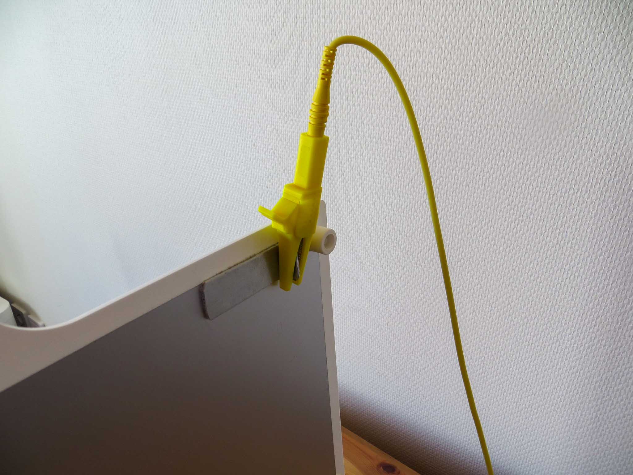 - 3. Rozładuj folię podnoszącą czarną sondą (aktualnie podłączoną do uziemienia podwójnym kablem), aby wyeliminować ryzyko porażenia prądem.