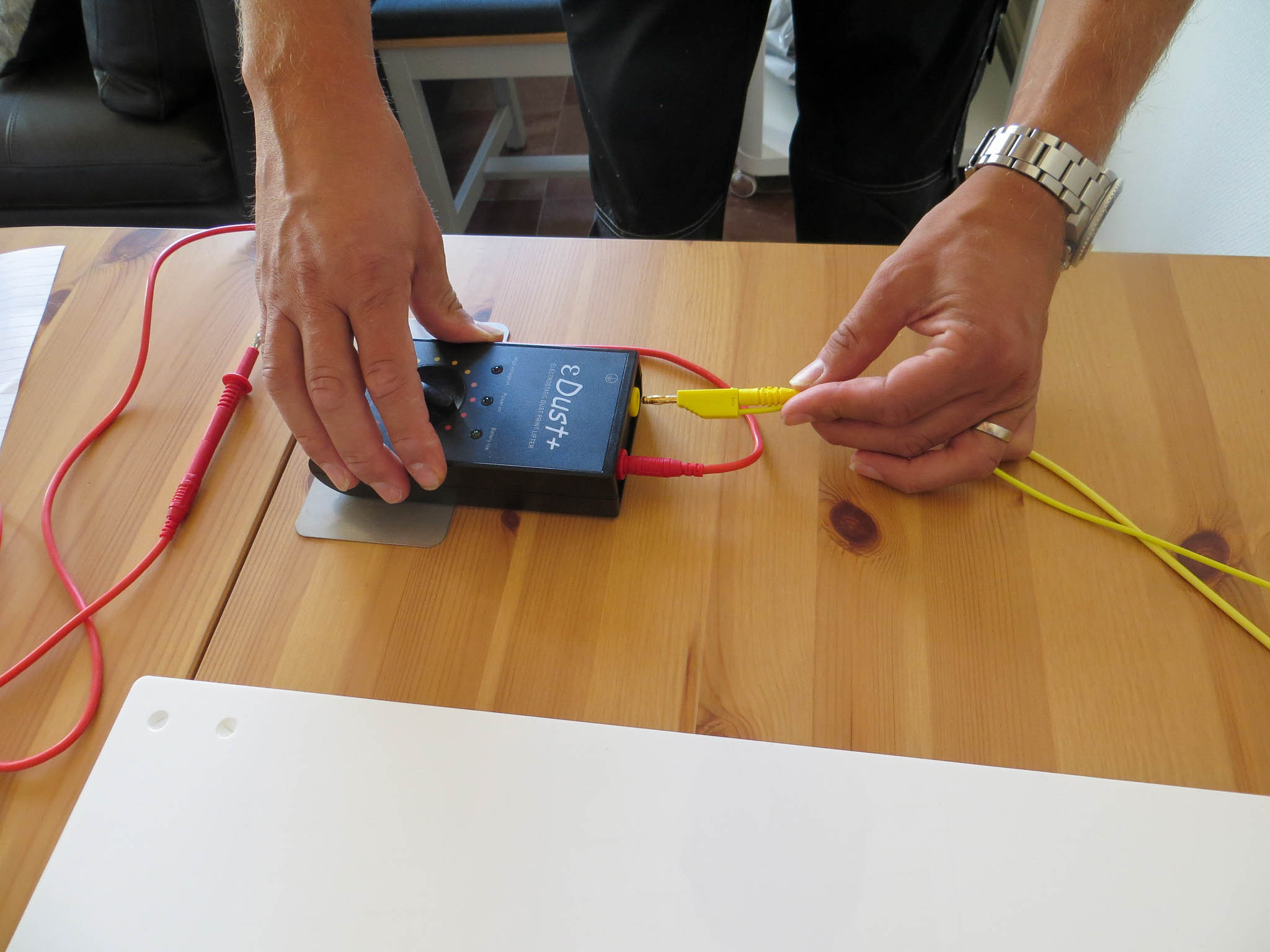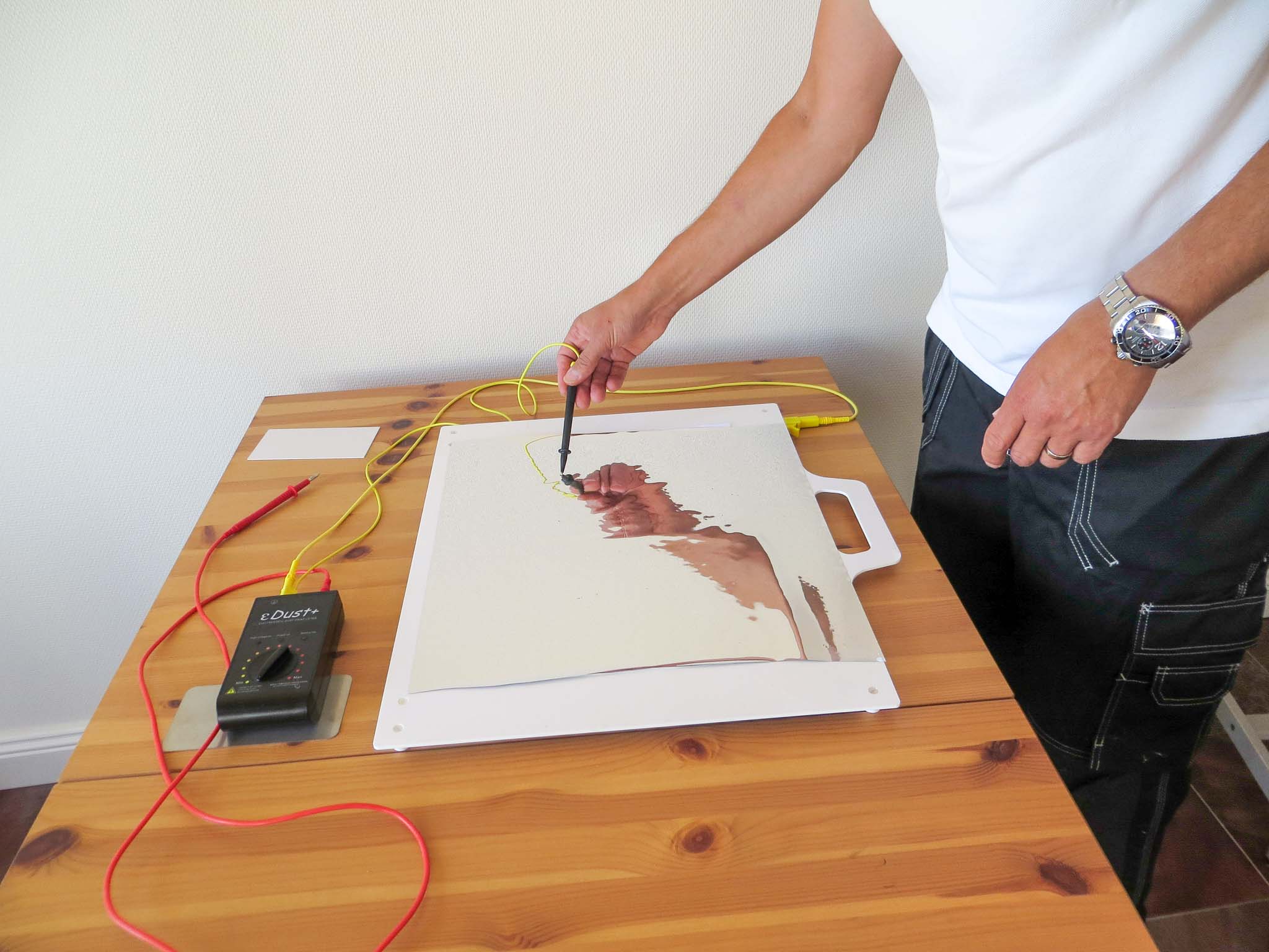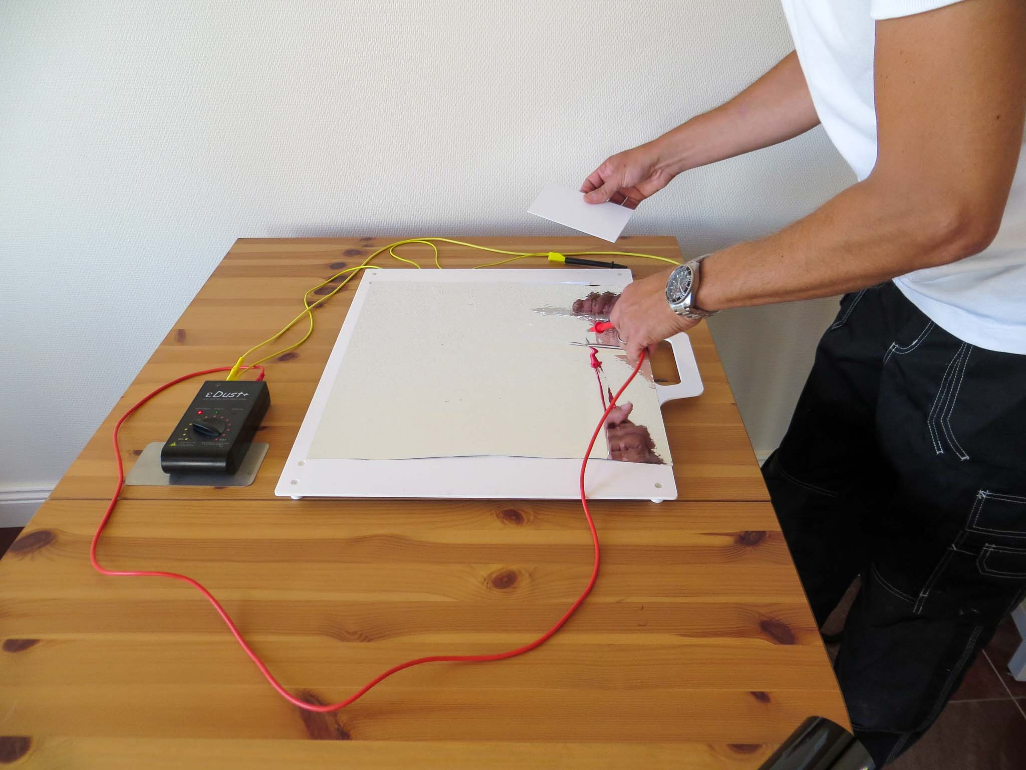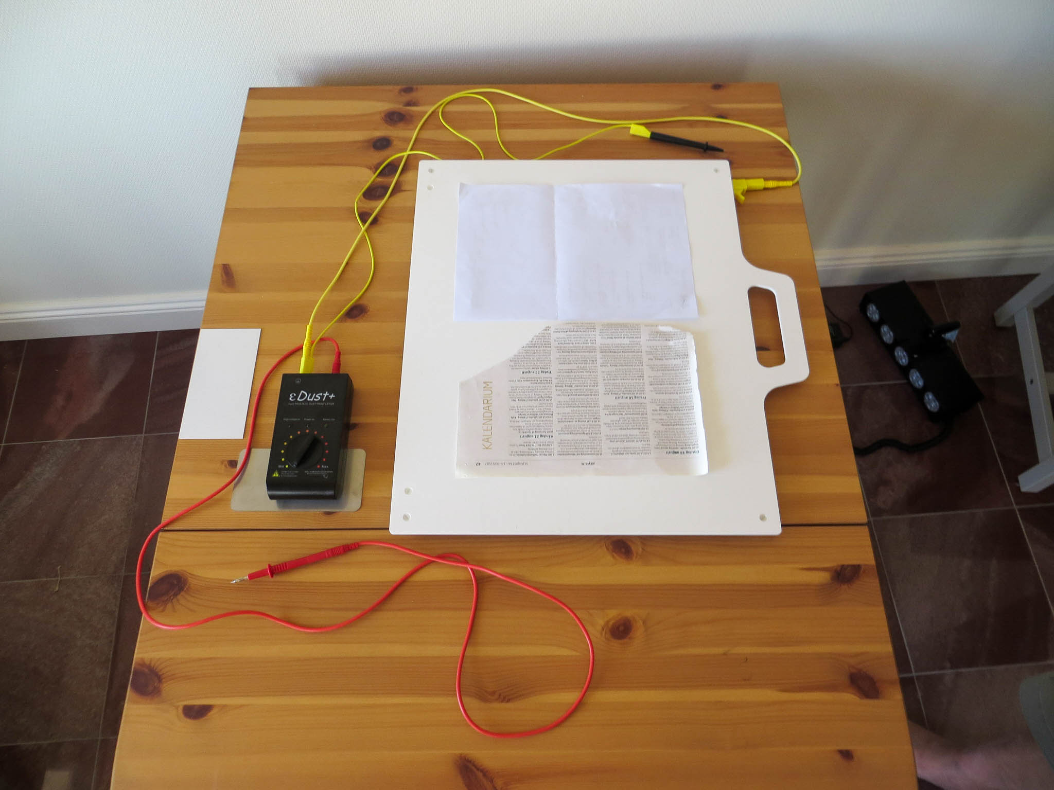 - 1. Podłącz podwójny kabel do urządzenia do ujawniania odcisków, a zacisk krokodylkowy do uziemienia płyty. Podłącz czerwony kabel z sondą wysokiego napięcia do urządzenia εDust+. Połóż odnaleziony arkusz(e) papieru na płycie podnoszącej i przykryj folią.