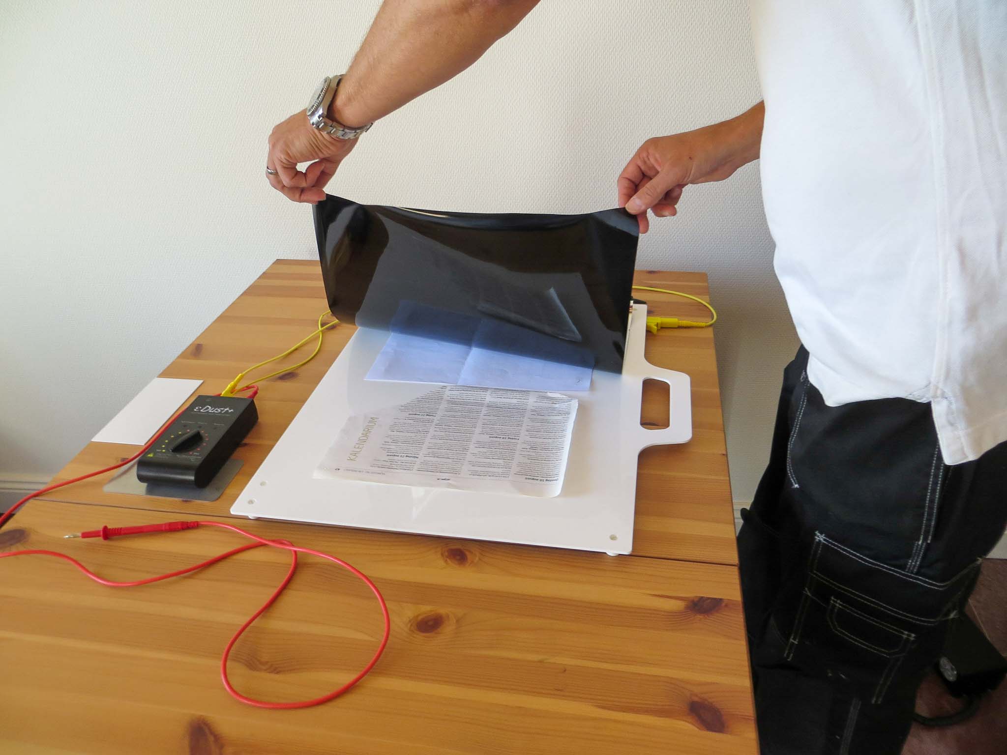 - 2. Naładuj folię podnoszącą sondą wysokiego napięcia i użyj plastikowego spłaszczacza, aby usunąć pęcherzyki powietrza.
