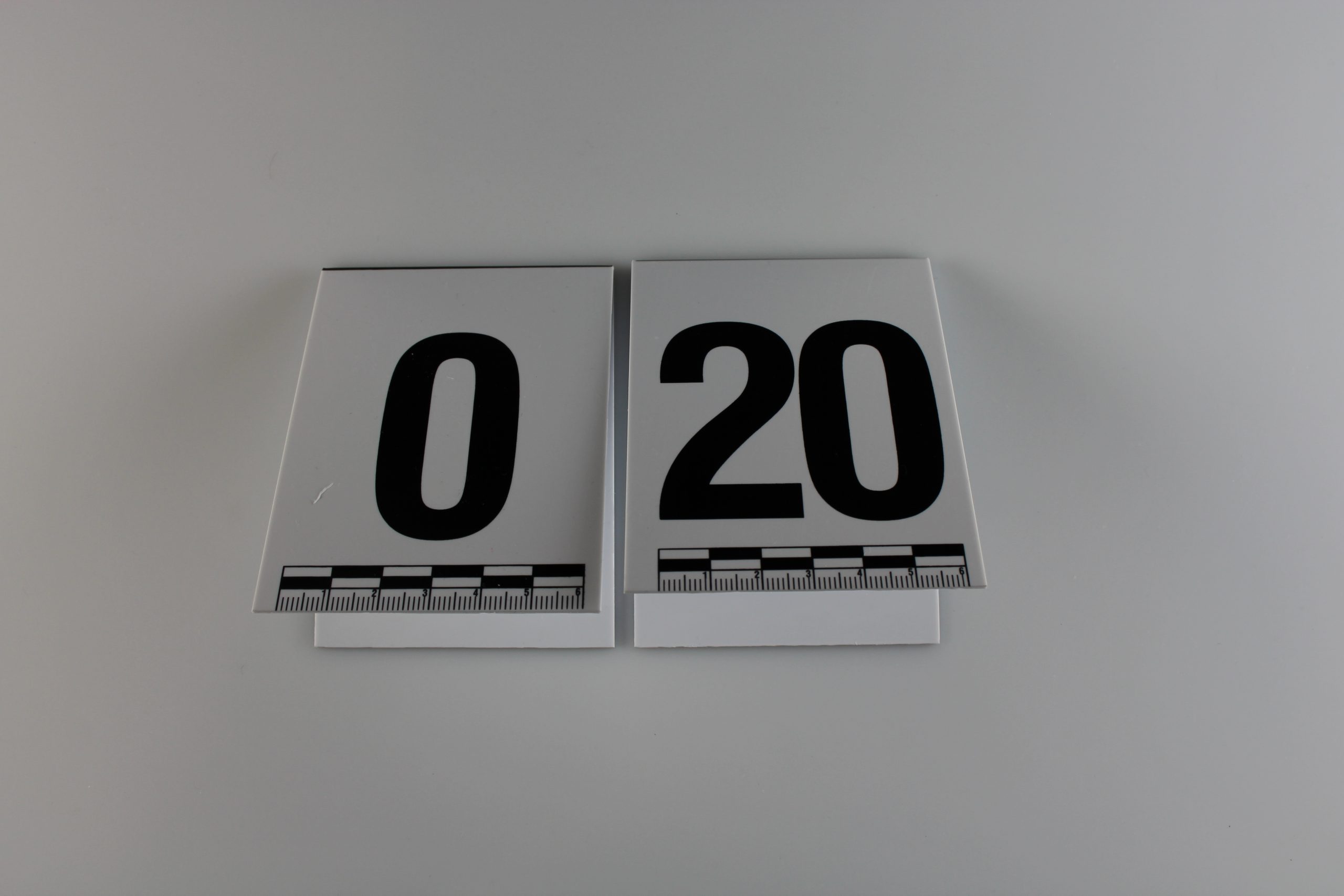 Numerki stojące tzw. „daszki” mają czarny nadruk na białym tle z jednej stronny i białe nadruk na czarnym tle z drugiej strony. Mają wymiary 7cm x 9cm oraz na dolnej krawędzi mają umieszczoną podziałkę (mm) i są składane piętrowo do transportu.