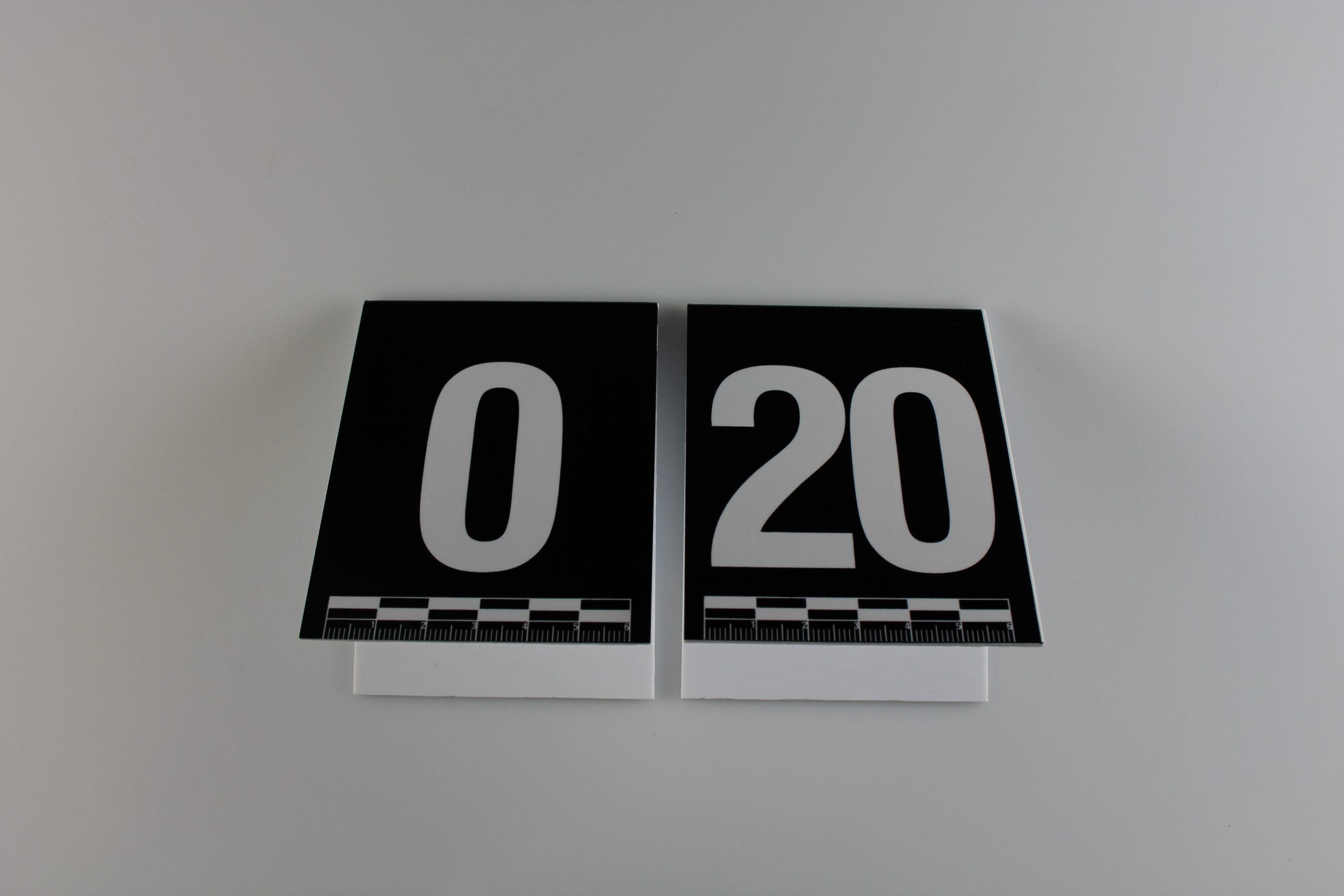 Numerki stojące tzw. „daszki” mają czarny nadruk na białym tle z jednej stronny i białe nadruk na czarnym tle z drugiej strony. Mają wymiary 7cm x 9cm oraz na dolnej krawędzi mają umieszczoną podziałkę (mm) i są składane piętrowo do transportu.